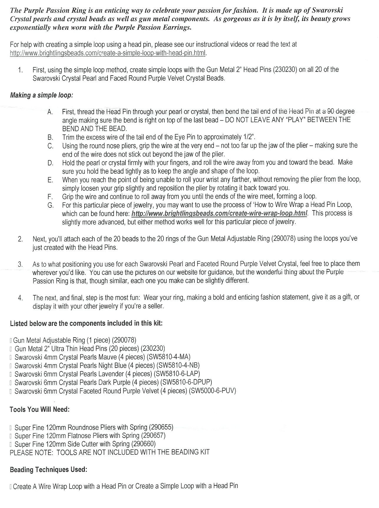 for us to follow. The When Roseann purchased the ring kit, she purchased three more silver ring blanks which will go to the first come three who ask to purchase it. Still you will need to bring the 20 head pins and the beads. See the list below. Also bring the usual tools.