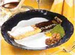 If you want to serve the crepes flaming, fold them into triangle shapes and brown both sides. Put two triangles on each plate, pour chocolate sauce on half of each and sprinkle the other with confectioners sugar. Heat tablespoons of rum until hot, splatter it over the crepes and carefully ignite.