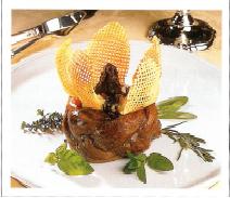 To Serve 1. Place 1 fried veal braid in the middle of a plate, fill it with Wild Rice Confetti and set a stuffed morel on top of the rice. 2. Spoon the potato puree into a pastry bag fitted with a star tip and press 5 stars around the top of each veal crown. Insert a waffle potato in these stars.